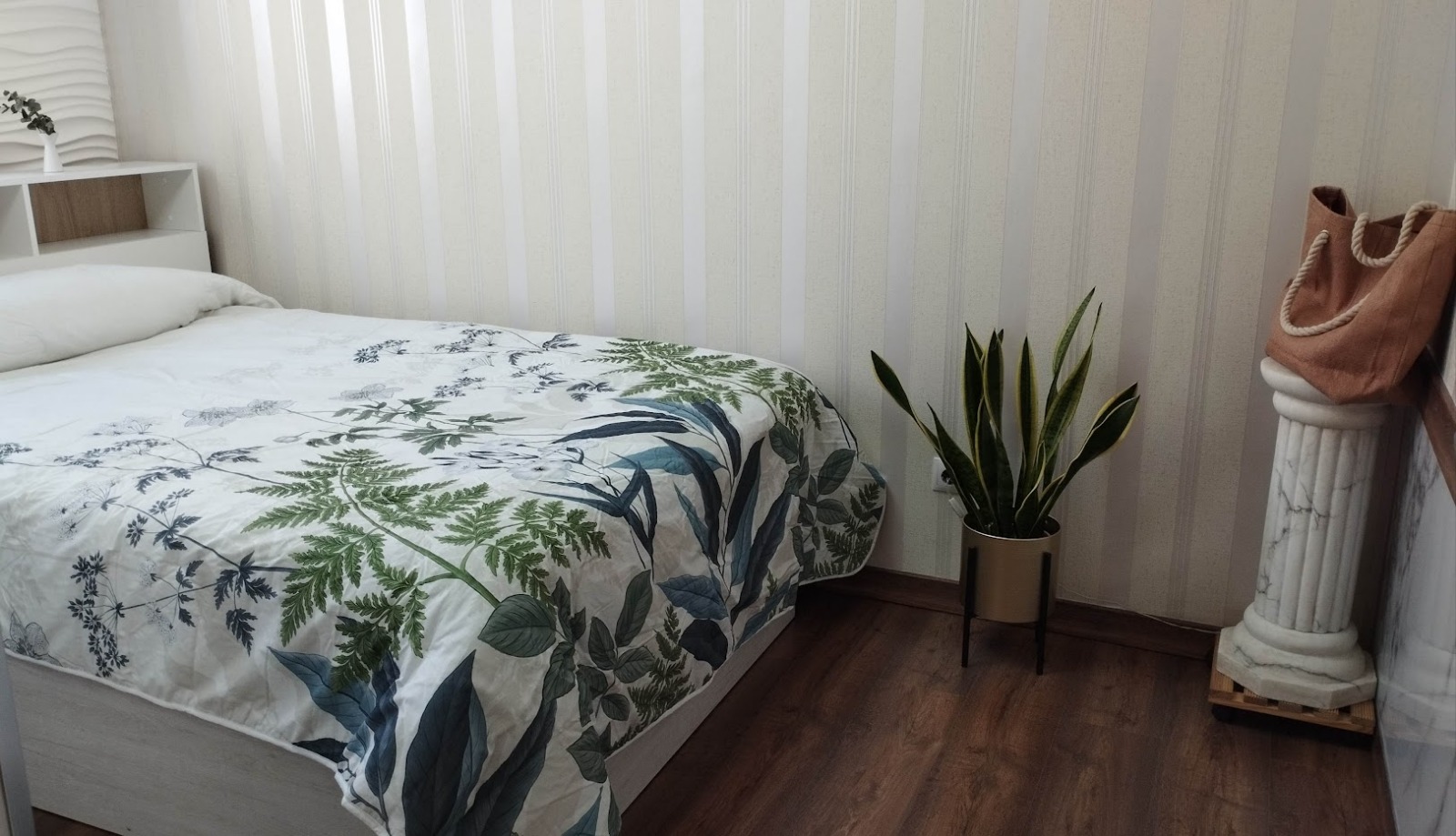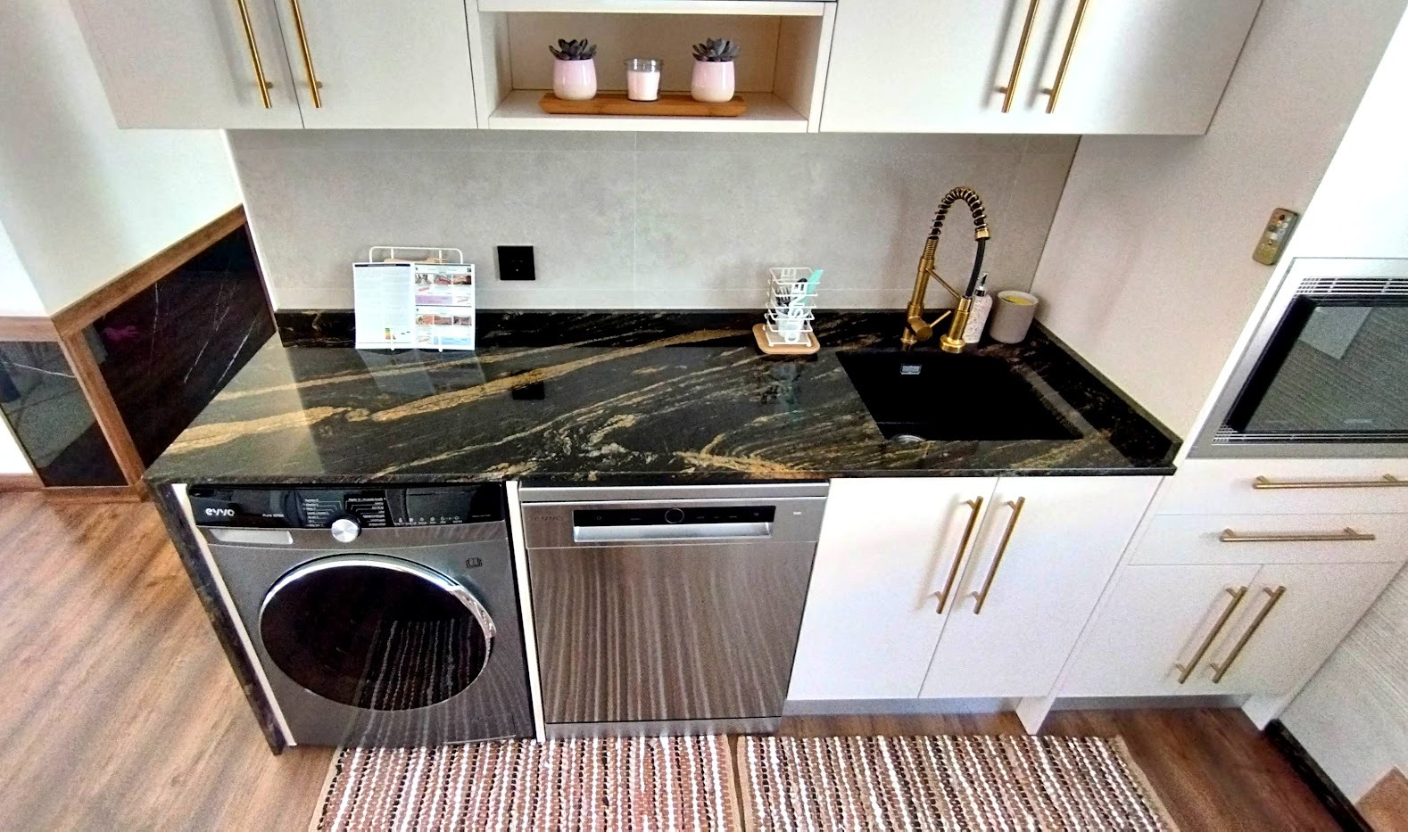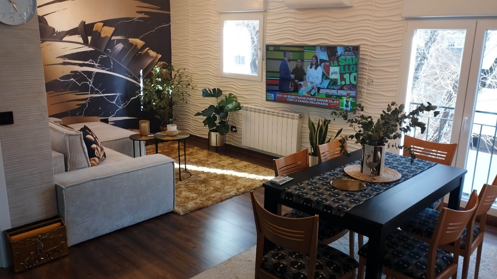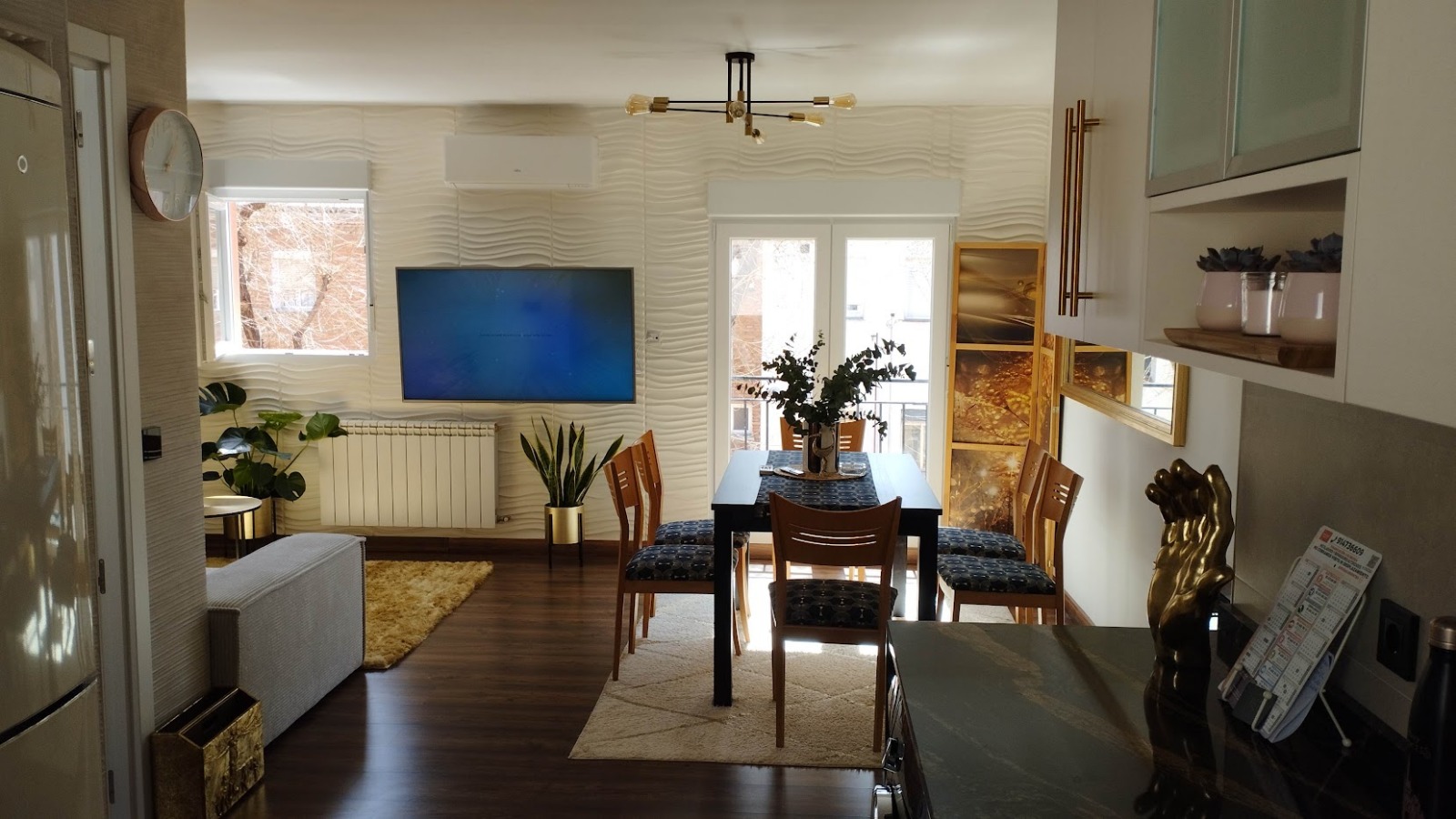 La reforma integral se ha realizado con materiales de alta calidad y con un criterio claro: crear un hogar funcional, elegante y duradero. El suelo de parquet aporta calidez y continuidad a toda la vivienda, mientras que la cocina se convierte en uno de sus grandes protagonistas, con una encimera en cascada de granito oscuro con vetas doradas, una pieza exclusiva que aporta carácter y sofisticación.